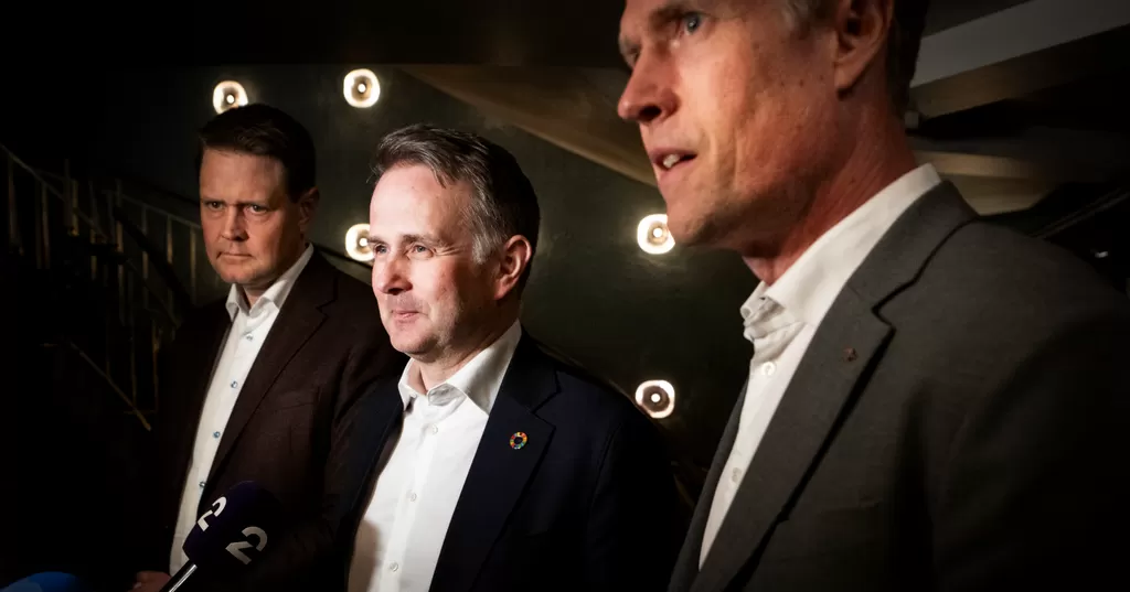 Norsk Industri-sjef Harald Solberg til venstre, riksmekler Mats Ruland i midten og Fellesforbundet-leder Christian Justnes til høyre. Foto:Håvard Sæbø