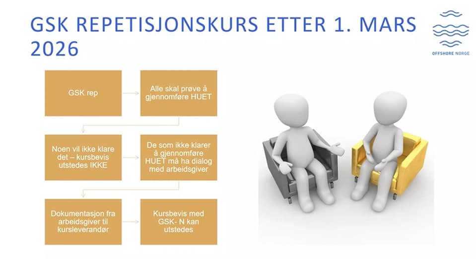 Det eneste alternativet for å få godkjent repetisjons kurs fra 1 mars uten og gjennomføre HUET er at den ansatte fremlegger en legeerklæring til arbeidsgiver. Det vil deretter blir det opp til arbeidsgiver godkjenne dokumentasjon og oversende bekreftelse til kursstedet at kursbevis kan utstedes.